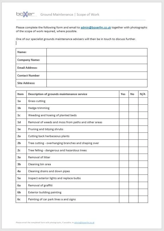 At Boxer FM we would normally provide an inspection for you and talk about your individual requirements, given recent events and changes in the way we are currently working, you could use our handy check list below to quickly assess work that is required and provide photographs as necessary.